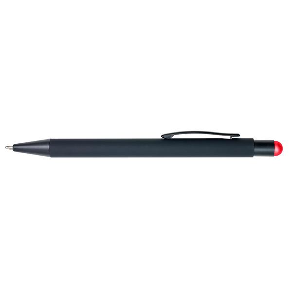 Długopis, touch pen z gumowanym wykończeniem, grawer ukazuje powierzchnię w kolorze zbliżonym do koloru gumowej końcówki lub w kolorze białym