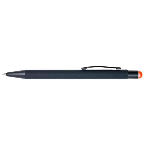 Długopis, touch pen z gumowanym wykończeniem, grawer ukazuje powierzchnię w kolorze zbliżonym do koloru gumowej końcówki lub w kolorze białym