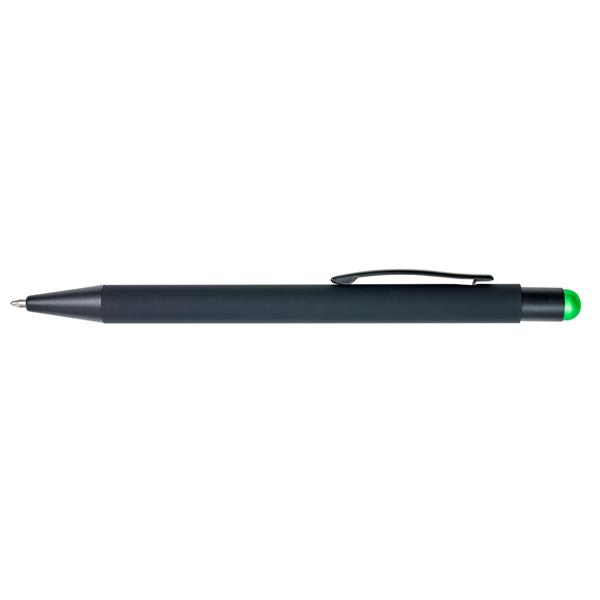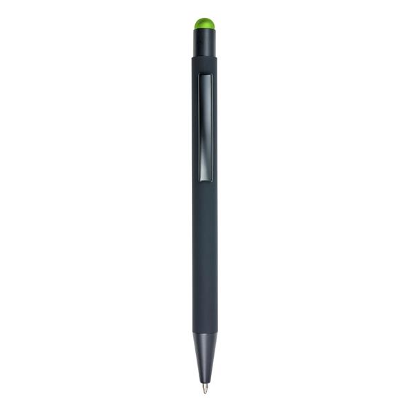 Długopis, touch pen z gumowanym wykończeniem, grawer ukazuje powierzchnię w kolorze zbliżonym do koloru gumowej końcówki lub w kolorze białym