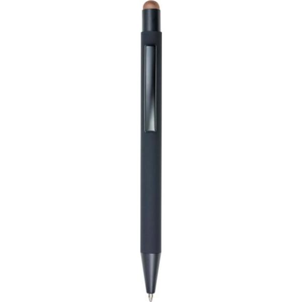 Długopis, touch pen z gumowanym wykończeniem, grawer ukazuje powierzchnię w kolorze zbliżonym do koloru gumowej końcówki lub w kolorze białym