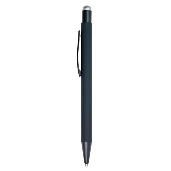 Długopis, touch pen z gumowanym wykończeniem, grawer ukazuje powierzchnię w kolorze zbliżonym do koloru gumowej końcówki lub w kolorze białym