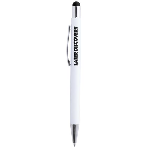 Długopis, touch pen, biały trzon, matowe wykończenie, grawer ukazuje lustrzaną powierzchnię w kolorze zbliżonym do gumowej końcówki