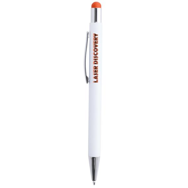 Długopis, touch pen, biały trzon, matowe wykończenie, grawer ukazuje lustrzaną powierzchnię w kolorze zbliżonym do gumowej końcówki