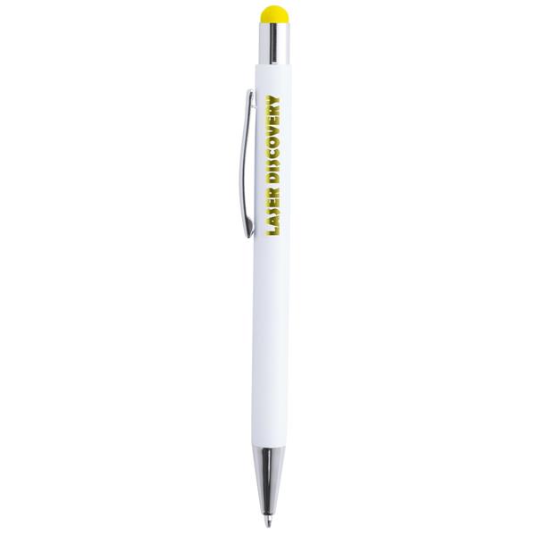Długopis, touch pen, biały trzon, matowe wykończenie, grawer ukazuje lustrzaną powierzchnię w kolorze zbliżonym do gumowej końcówki