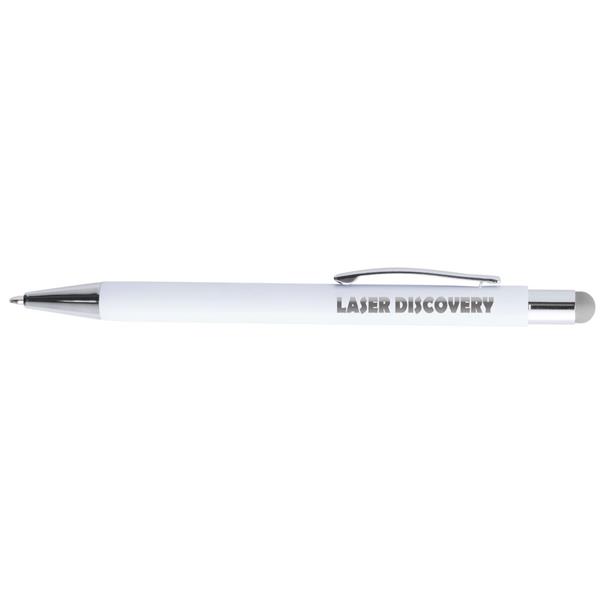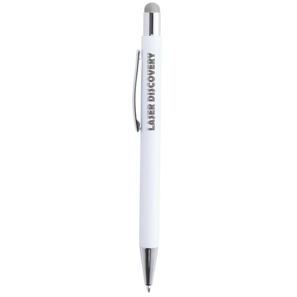 Długopis, touch pen, biały trzon, matowe wykończenie, grawer ukazuje lustrzaną powierzchnię w kolorze zbliżonym do gumowej końcówki