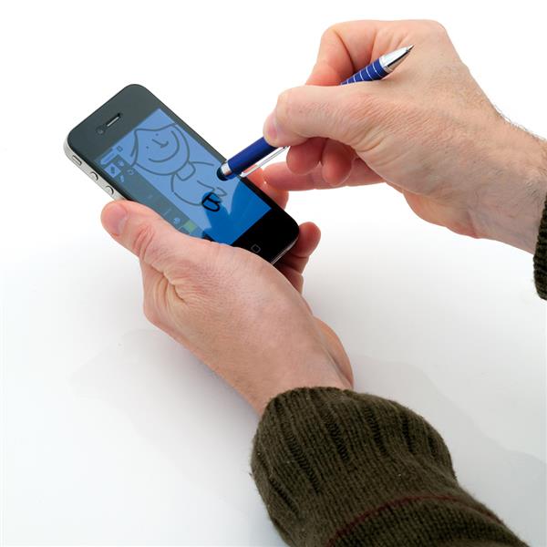 Długopis, touch pen z czarną gumową końcówką, kolorowym trzonem i srebrnymi elementami