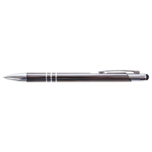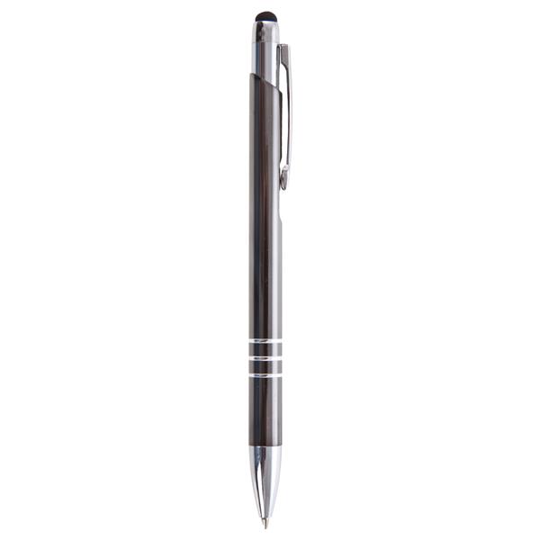 Długopis z kolorowym trzonem o błyszczącym wykończeniu, posiada elementy w kolorze srebrnym, końcówka touch pen umożliwiająca obsługę ekranów dotykowych, wkład w niebieskim kolorze, produkt wykonany z aluminium