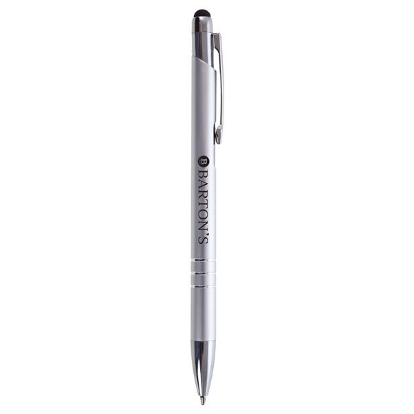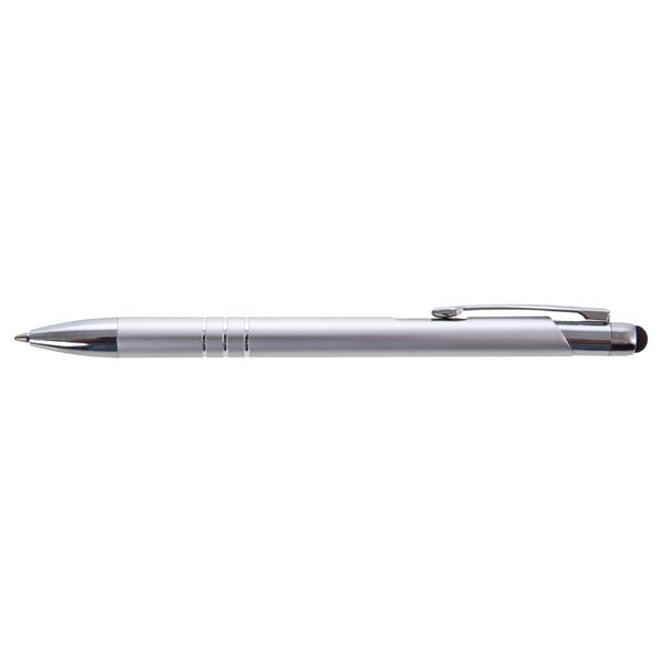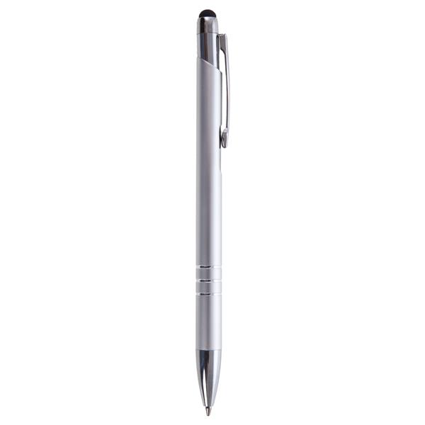 Długopis z kolorowym trzonem o błyszczącym wykończeniu, posiada elementy w kolorze srebrnym, końcówka touch pen umożliwiająca obsługę ekranów dotykowych, wkład w niebieskim kolorze, produkt wykonany z aluminium