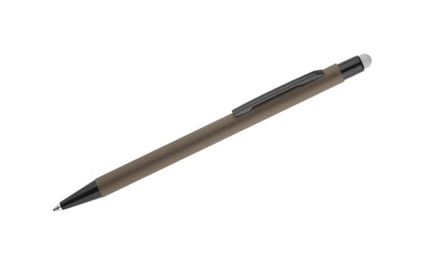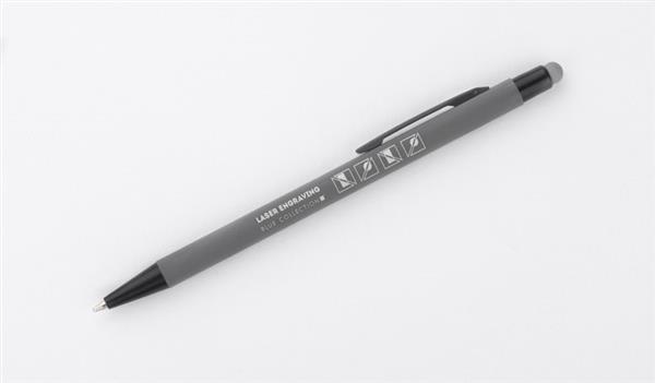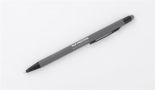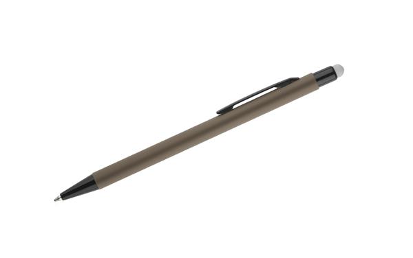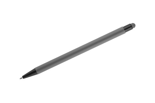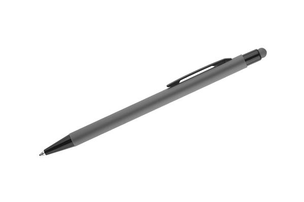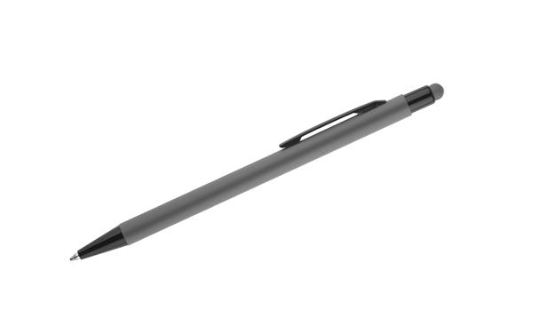 Klasyczny, cienki długopis PRIM wykonany z aluminium pokrytego gumowaną powłoką typu soft touch. Na górze końcówka do obsługi ekranów dotykowych w kolorze dopasowanym do korpusu długopisu. Wykończenia w kolorze czarnym. Długopis automatyczny. Wkład typu X20 w kolorze niebieskim.