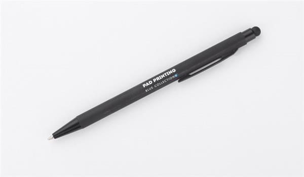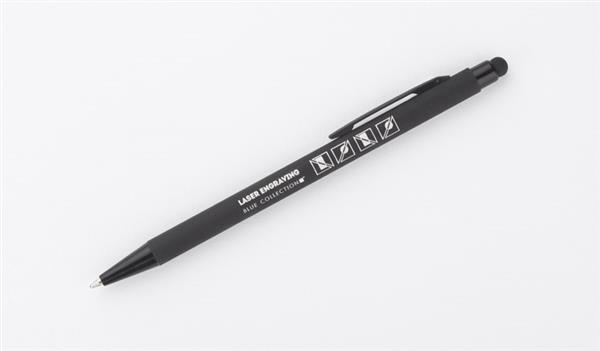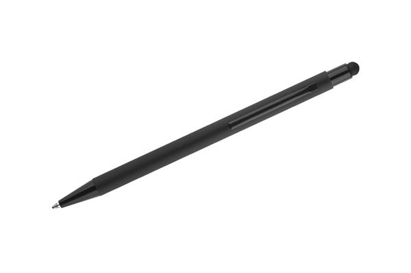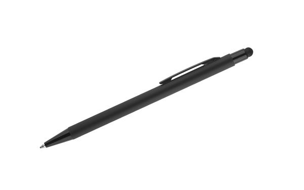 Klasyczny, cienki długopis PRIM wykonany z aluminium pokrytego gumowaną powłoką typu soft touch. Na górze końcówka do obsługi ekranów dotykowych w kolorze dopasowanym do korpusu długopisu. Wykończenia w kolorze czarnym. Długopis automatyczny. Wkład typu X20 w kolorze niebieskim.