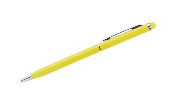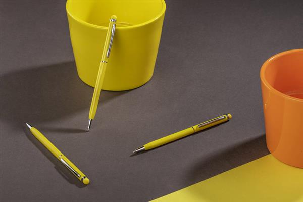 Cienki, metalowy długopis z kolorową końcówką do ekanów dotykowych (touch). Długopis posiada mechanizm typu „twist”. Uwaga – Wkład może się chować w trakcie pisania – Reklamacji na to nie przyjmujemy.