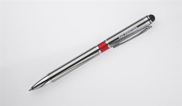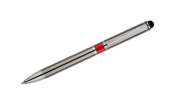Elegancki metalowy długopis z kolorową aplikacją na korpusie oraz touchpenem.