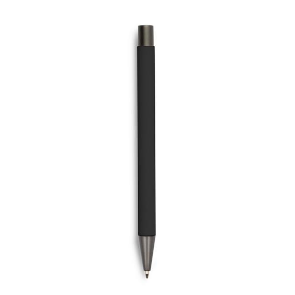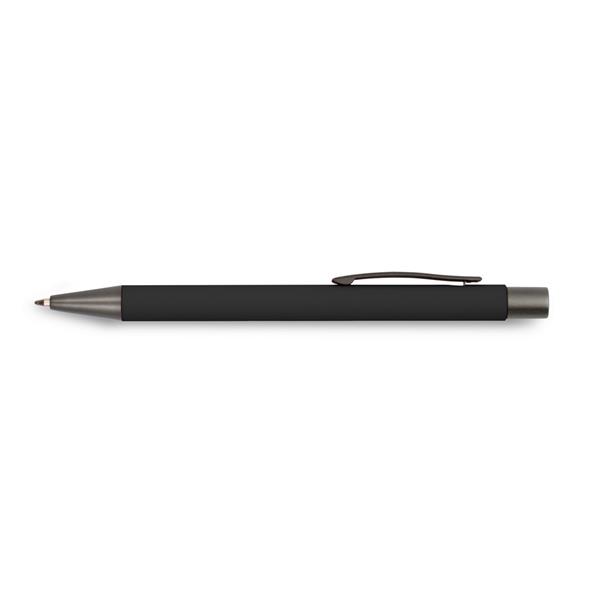 Długopis z kolorowym trzonem i szarymi elementami, posiada gumowe wykończenie, wkład w niebieskim kolorze, produkt wykonany z aluminium, plastiku i metalu