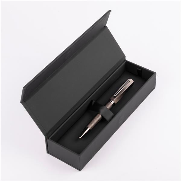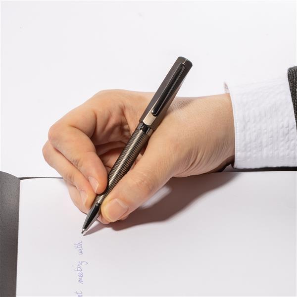 Długopis Twist Gun charakteryzuje się solidną konstrukcją. Posiada skręcany wzór na skuwce oraz kontrastujące wzór siatki na korpusie. Długopis został wykonany z mosiądzu, posiada wkład piszący na niebiesko. Rozmiar: Dia. 13 / h. 138 mm Kolor: Szary