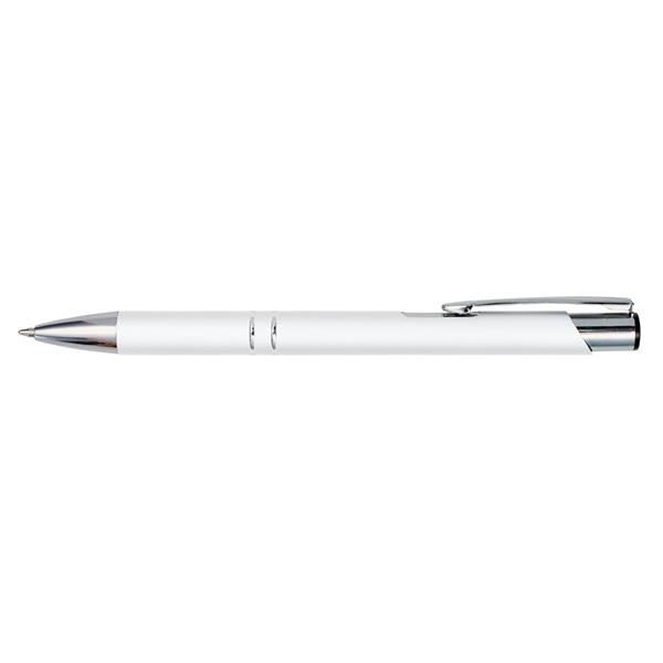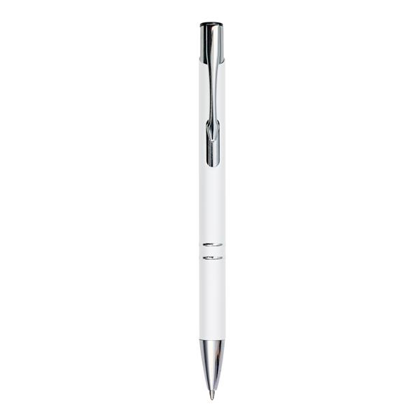 Długopis z gumowanym wykończeniem i srebrnymi elementami, grawer ukazuje lustrzaną powierzchnię