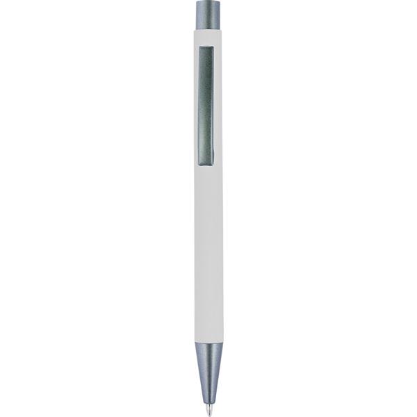 Długopis z kolorowym, gumowanym trzonem i szarymi elementami, grawer ukazuje lustrzaną powierzchnię