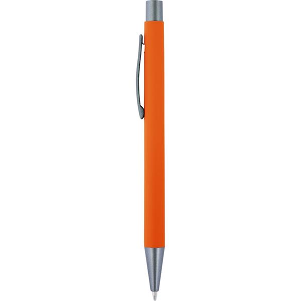 Długopis z kolorowym, gumowanym trzonem i szarymi elementami, grawer ukazuje lustrzaną powierzchnię