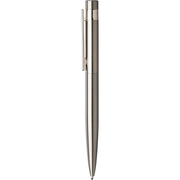 Długopis przekręcany, posiada wkład w niebieskim kolorze, ikona stali nierdzewnej z recyklingu na produkcie, zapakowany w pudełko prezentowe z papieru kraftowego, produkt wykonany ze stali nierdzewnej z recyklingu