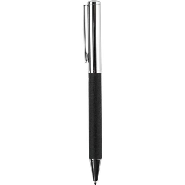 Długopis przekręcany, wykonany z metalu i RPET, wkład w niebieskim kolorze, ikona RPET na produkcie, zapakowany w brązowe kartonowe pudełko
