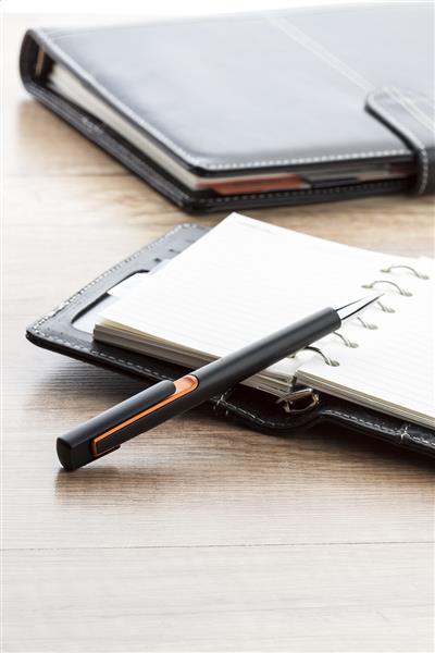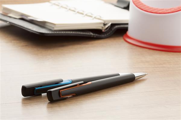 Plastikowy długopis z kolorowymi wykończeniami i chromowaną końcówką. Z niebieskim wkładem.