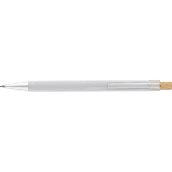 Długopis, bambusowy przycisk, metalowy klips, wkład w niebieskim kolorze, ikona recyklingu na produkcie, wystarcza na ok. 800 m pisania, produkt wykonany z ABS z recyklingu, aluminium i bambusa