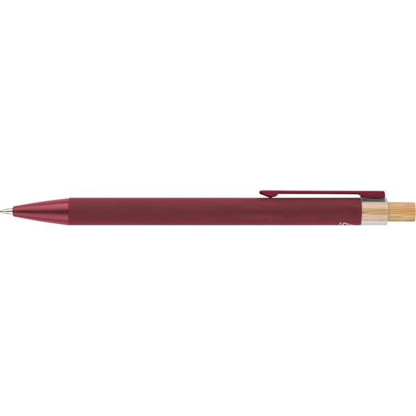 Długopis, bambusowy przycisk, metalowy klips, wkład w niebieskim kolorze, ikona recyklingu na produkcie, wystarcza na ok. 800 m pisania, produkt wykonany z ABS z recyklingu, aluminium i bambusa