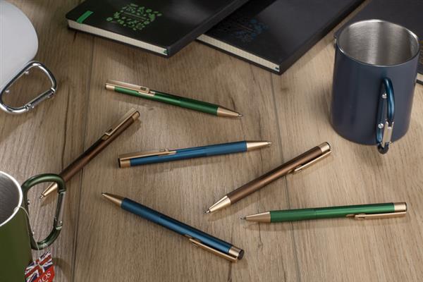 Długopis VITE to elegancki model wykonany z metalu, wyposażony w automatyczny mechanizm wysuwu. Korpus w matowym wykończeniu kontrastuje z chromowanymi detalami i klipem w kolorze szampańskiego złota. Długopis posiada wkład typu G2 z tuszem półżelowym o grubości pisania 1,0 mm, który zapewnia płynny, równy zapis. Dzięki solidnej konstrukcji i starannemu wykończeniu stanowi idealny gadżet reklamowy dla osób ceniących nowoczesny design i precyzję pisania.