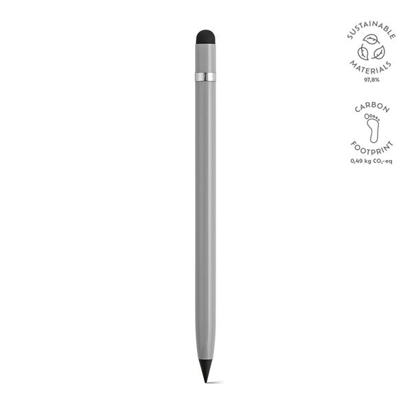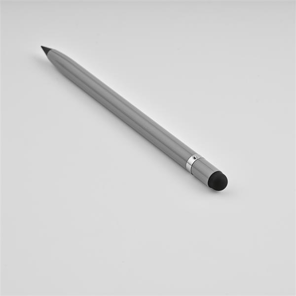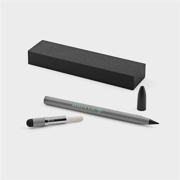 Wykonane z aluminium pochodzącego z recyklingu pióro atramentowe na nowo definiuje pisanie – jest to nieskończone pióro z grafitową końcówką. Wzbogacony o antypoślizgowy srebrny detal, wewnętrzną gumkę i końcówkę dotykową. Prezentowany w indywidualnym pudełku z papieru z recyklingu.