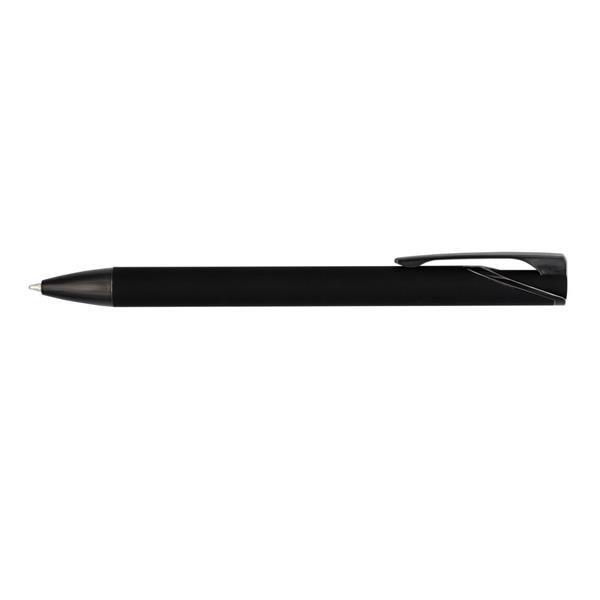 Długopis z kolorowym matowym trzonem i błyszczącymi elementami, wkład w niebieskim kolorze, czarne papierowe etui w komplecie, grawer ukazuje lustrzaną powierzchnię, produkt wykonany z metalu