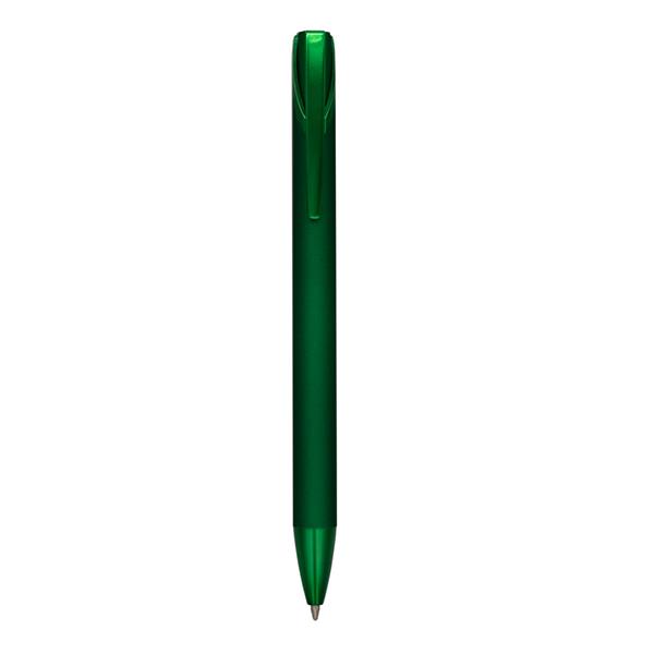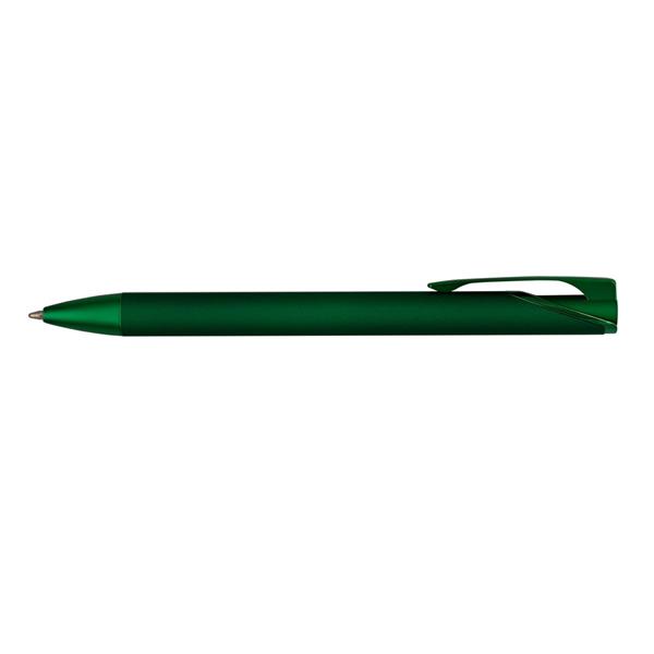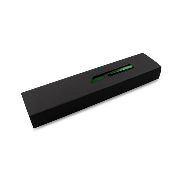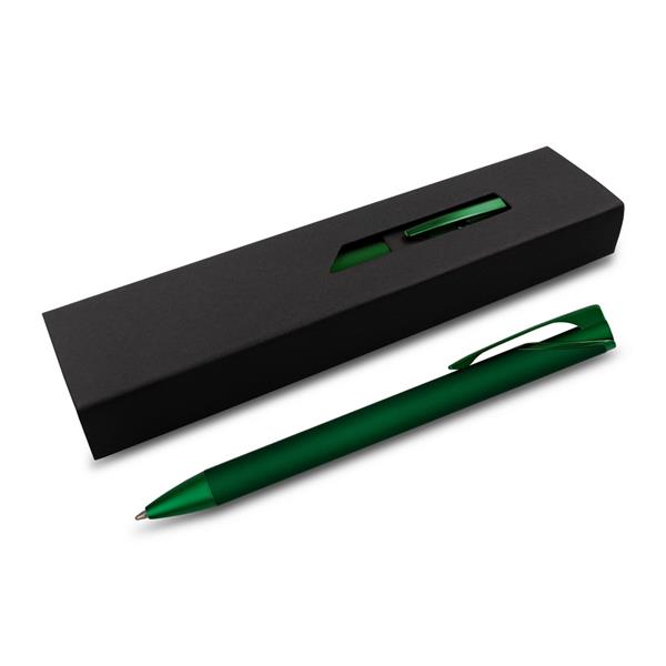 Długopis z kolorowym matowym trzonem i błyszczącymi elementami, wkład w niebieskim kolorze, czarne papierowe etui w komplecie, grawer ukazuje lustrzaną powierzchnię, produkt wykonany z metalu