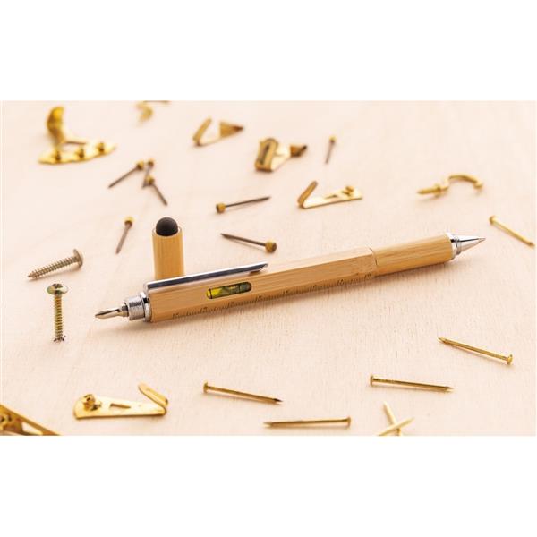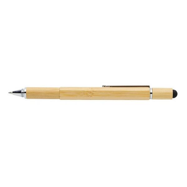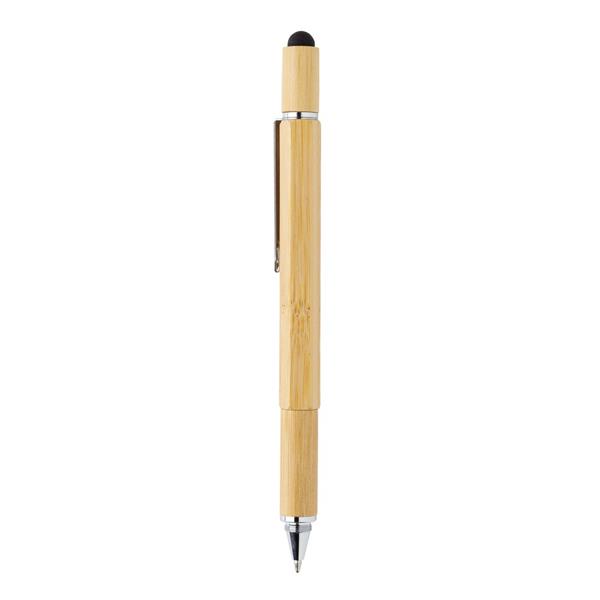 Długopis wielofunkcyjny 5 w 1, linijka 7 cm, poziomica, śrubokręt, touch pen, wykonany z bambusa, aluminiowy klip, długość pisania do 400 m, ślad węglowy produktu: 0,13 kg CO2