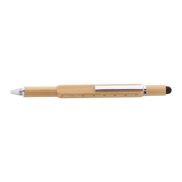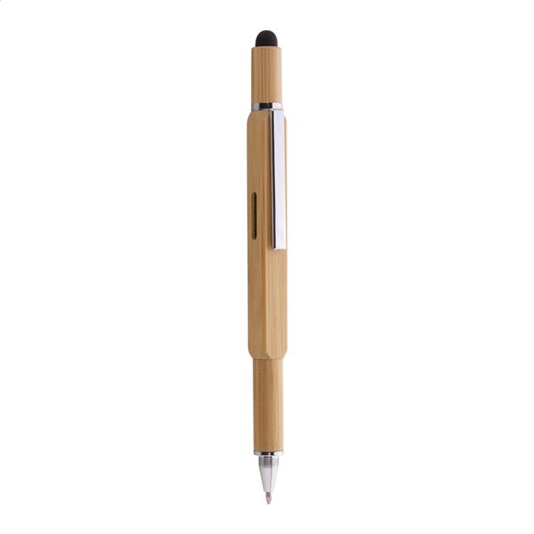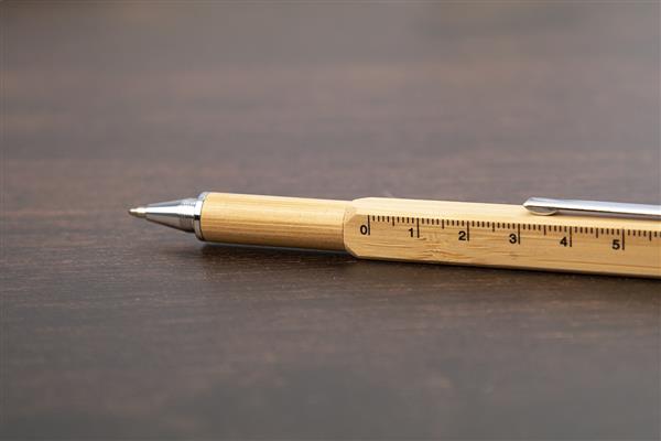 Wielofunkcyjny długopis do ekranów dotykowych. Wykonany z bambusa z przekręcanym mechanizmem. Posiada funkcję wkrętaka, poziomicy i linijkę 7 cm. Z niebieskim wkładem.