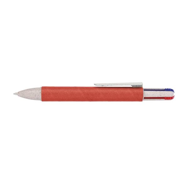 Czterokolorowy długopis, kolory wkładów: niebieski, czarny, czerwony i zielony, długość pisania 300 metrów na każdy kolor, klip ułatwiający zawieszanie na kieszeni albo okładce notatnika, produkt wykonany z kartonu pochodzącego z recyklingu i słomy pszenicznej