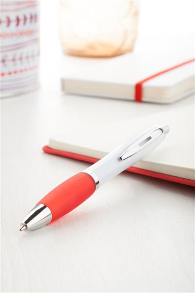 Plastikowy biały długopis z kolorowym uchwytem i chromowymi wykończeniami. Z niebieskim wkładem.
