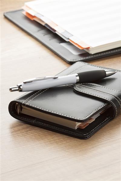 Plastikowy biały długopis z kolorowym uchwytem i chromowymi wykończeniami. Z niebieskim wkładem.