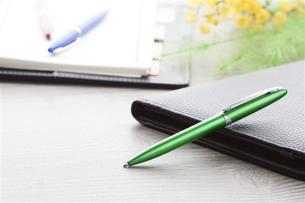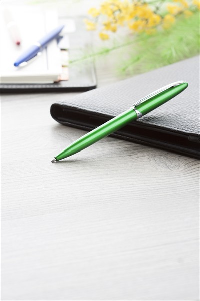 Plastikowy długopis, dostarczany z niebieskim wkładem.