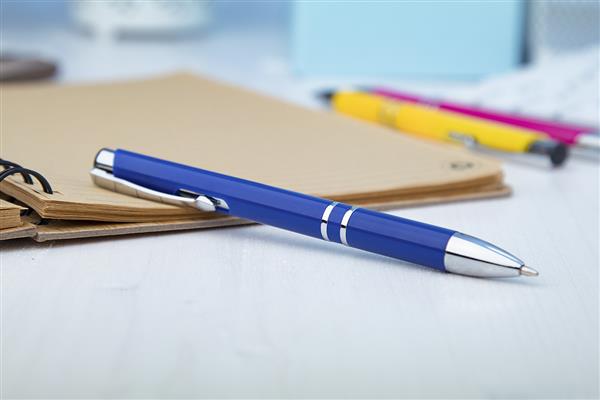 Plastikowy długopis z błyszczącym klipem i końcówką. Z niebieskim wkładem.