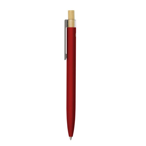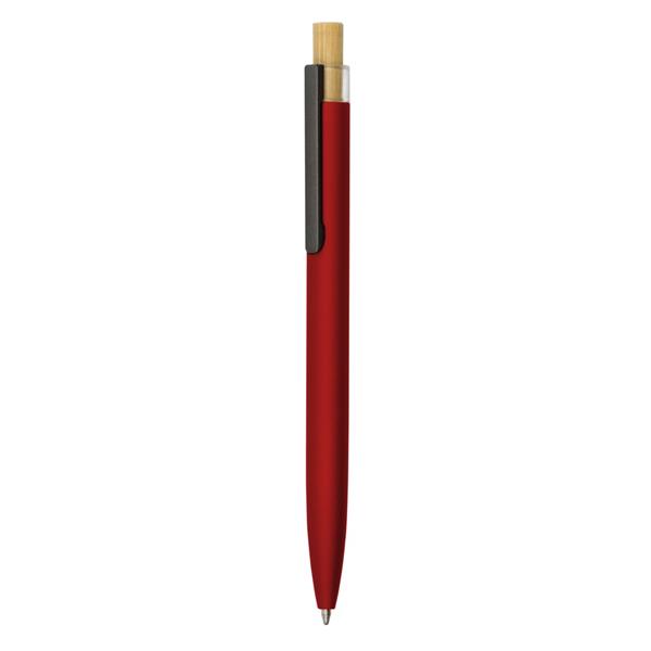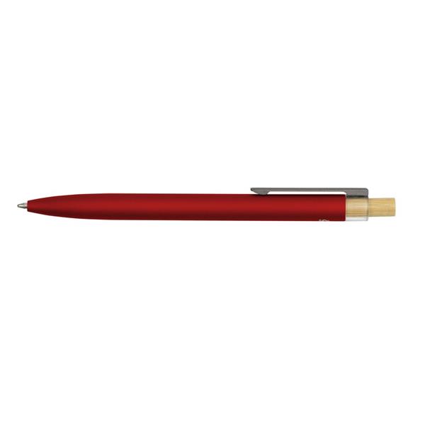 Długopis z kolorowym trzonem i elementami w szarym kolorze, posiada bambusowy przycisk, wkład w granatowym kolorze, produkt wykonany z aluminium z recyklingu, bambusa i RPET