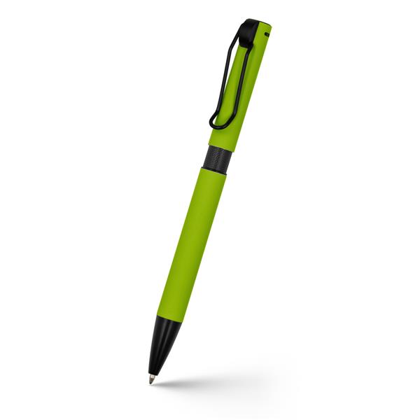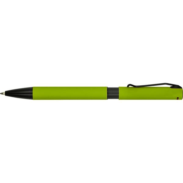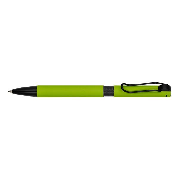 Długopis z kolorowym gumowanym trzonem, czarnymi elementami i drucianym klipem