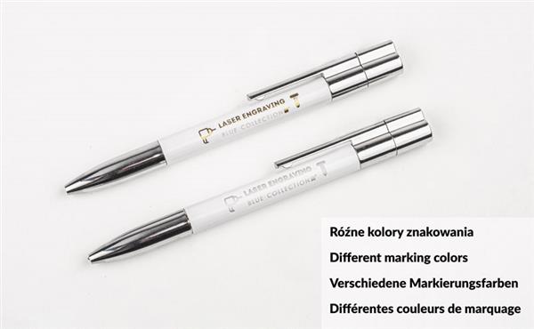 Wykonany z aluminium gustowny długopis wyposażony został w przenośną pamięć USB o pojemności 8 GB. Pamięć umieszczona została nad klipem długopisu. Standard usb: 2.0; szybkość zapisu: 4,5 MB/s; szybkość odczytu: 25,0 MB/. Pamięć USB objęta jest 5 letnią gwarancją producenta oraz posiada certyfikat CE.