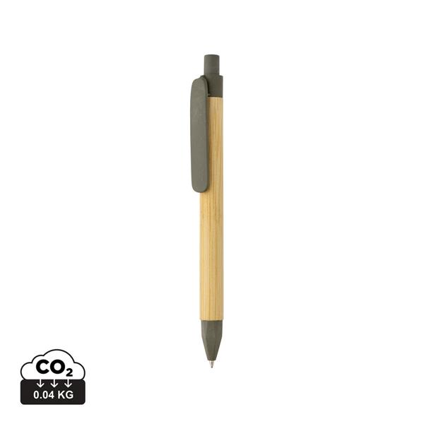 Długopis, wykonany z papieru z recyklingu, bambusowy wzór na trzonie, klip ze słomy pszenicznej, niemiecki wkład Dokumental® w kolorze niebieskim w komplecie, długość pisania ok. 1000 m, kulka TC zapewnia wygodne pisanie, ślad węglowy produktu: 0,03 kg CO2