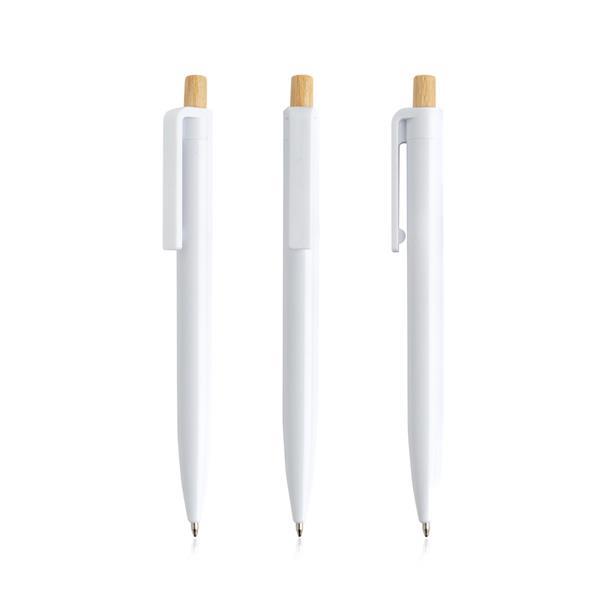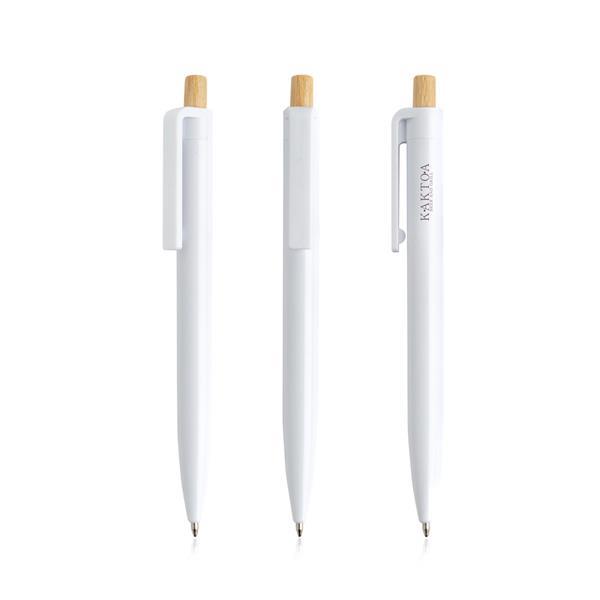 Długopis z recyklingowanego ABS z bambusowym detalem. Recyklingowany długopis o unikalnym kolorze i bambusowym przyciskiem. Z mechanizmem wciskanym i piszący na niebiesko, jest doskonałym wyborem na prezent, który promuje markę i wspiera ochronę środowiska. Rozmiar: 0 x 0 x 13,5 cm T1 (tampodruk): 4 x 0,6 DC0 (długopisy, zapalniczki): 5 x 0,5 Kolor: Biały