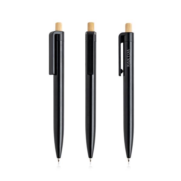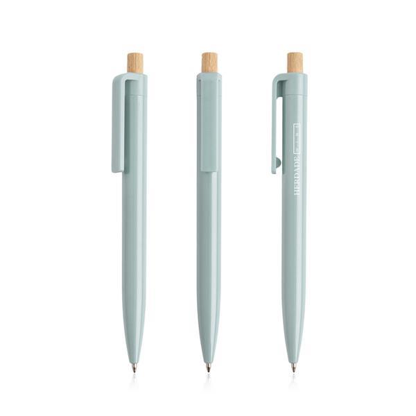 Długopis z recyklingowanego ABS z bambusowym detalem. Recyklingowany długopis o unikalnym kolorze i bambusowym przyciskiem. Z mechanizmem wciskanym i piszący na niebiesko, jest doskonałym wyborem na prezent, który promuje markę i wspiera ochronę środowiska.