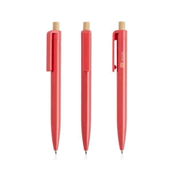 Długopis z recyklingowanego ABS z bambusowym detalem. Recyklingowany długopis o unikalnym kolorze i bambusowym przyciskiem. Z mechanizmem wciskanym i piszący na niebiesko, jest doskonałym wyborem na prezent, który promuje markę i wspiera ochronę środowiska. Rozmiar: 0 x 0 x 13,5 cm T1 (tampodruk): 4 x 0,6 DC0 (długopisy, zapalniczki): 5 x 0,5 Kolor: Czerwony
