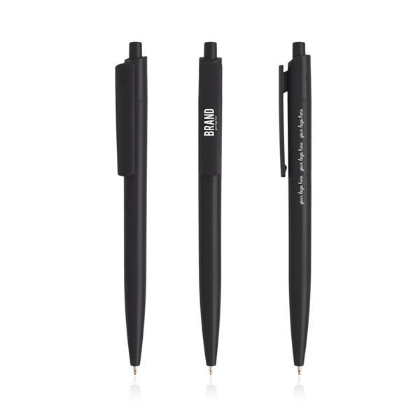 Długopis z recyklingowanego ABS. Recyklingowany długopis o nowoczesnym designie, z szerokim klipsem i jednokolorowym korpusem. Ten długopis z mechanizmem wciskanym pisze na niebiesko. Zobacz także wersję z białym korpusem i kolorowym klipsem, numer 131543.