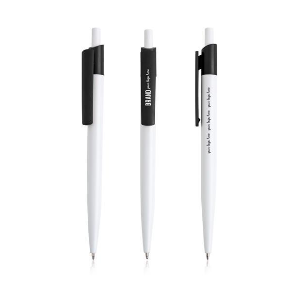 Długopis z recyklingowanego ABS. Recyklingowany długopis o nowoczesnym designie, z szerokim kolorowym klipsem i białym korpusem. Ten długopis z mechanizmem wciskanym pisze na niebiesko. Zobacz także wersję z kolorowym korpusem, numer 131542.