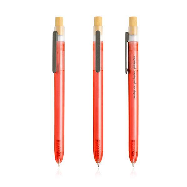 Długopis z bambusowym detalem. Długopis wykonany z przetworzonego plastiku z oceanów, z przezroczystym korpusem i bambusowym przyciskiem, pisze na niebiesko. Zobacz także wersję z przezroczystym korpusem 131597