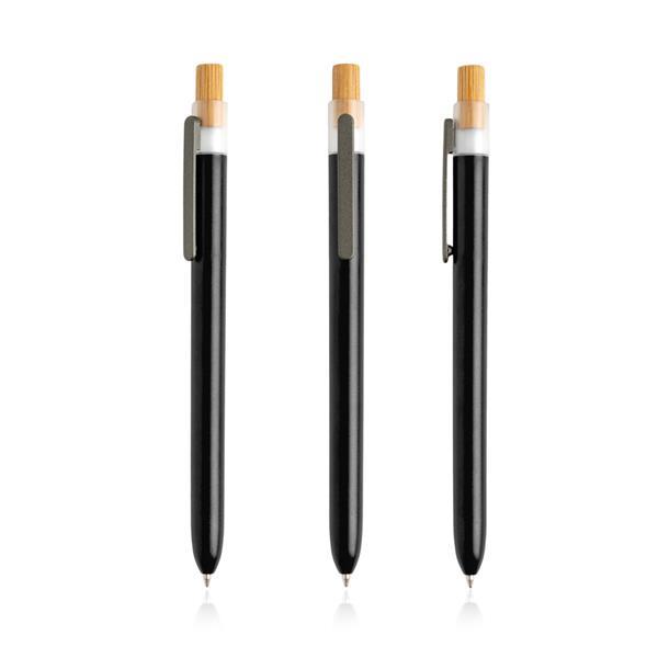 Długopis z bambusowym detalem. Długopis wykonany z przetworzonego plastiku oceanicznego, z jednolitym kolorem korpusu i bambusowym przyciskiem, pisze na czarno. Zobacz także wersję z przezroczystym korpusem 131598.