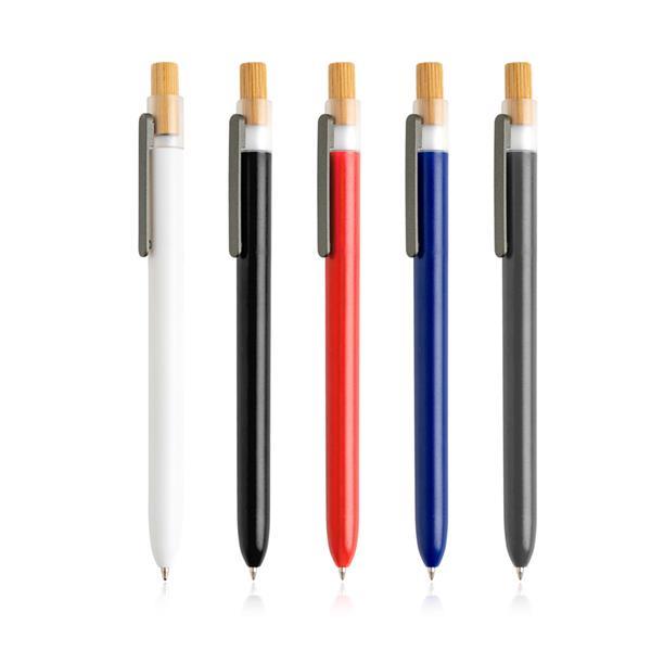 Długopis z bambusowym detalem. Długopis wykonany z przetworzonego plastiku oceanicznego, z jednolitym kolorem korpusu i bambusowym przyciskiem, pisze na czarno. Zobacz także wersję z przezroczystym korpusem 131598.