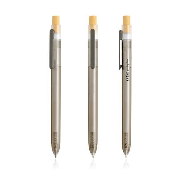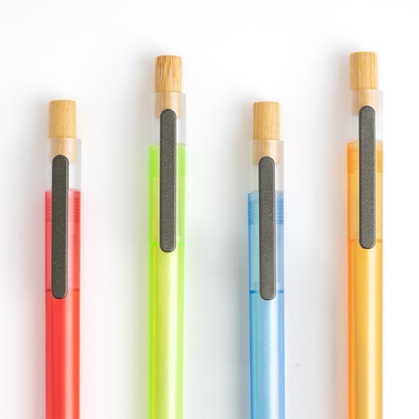 Długopis z bambusowym detalem. Długopis wykonany z przetworzonego plastiku z oceanów, z przezroczystym korpusem i bambusowym przyciskiem, pisze na niebiesko. Zobacz także wersję z przezroczystym korpusem 131597